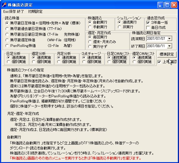 通常は、株価読込自動実行とそれに引き続くシュミレーションの連続実行を指定します。