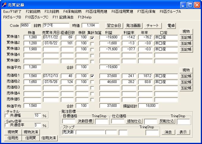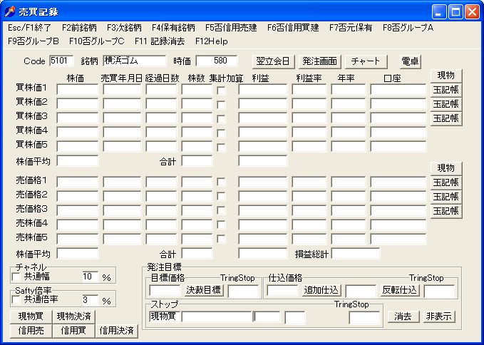 チャート画面の「F1売買」で、自分の持ち株や過去の取引を銘柄毎に記録できます。