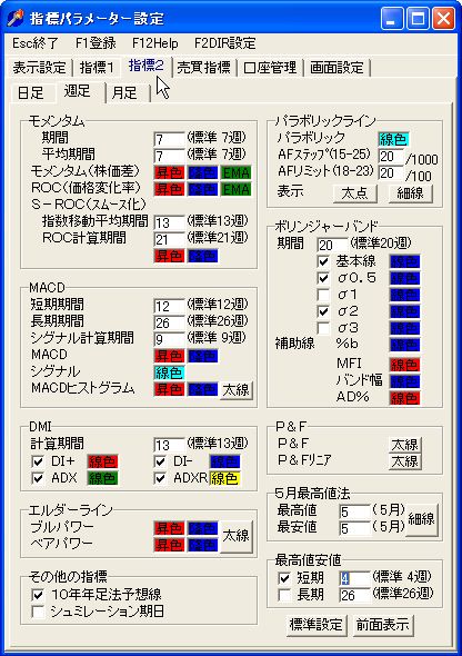 このページの設定は、指標の定数の指定が主で、指標の表示指定は、「指標パラメーター設定」画面の1ページの「表示設定」で行います。