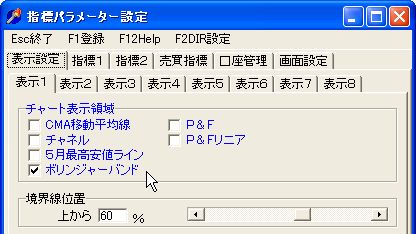 ボリンジャーラインの表示・非表示は、「指標パラメーター設定」画面の1ページの「表示設定」の「チャート表示領域」で行います。