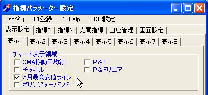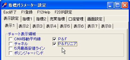 「P&F」・「P&Fリニア」の表示・非表示は、「指標パラメーター設定」画面の1ページの「表示設定」の「チャート表示領域」で行います。