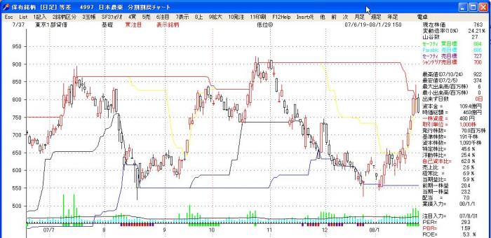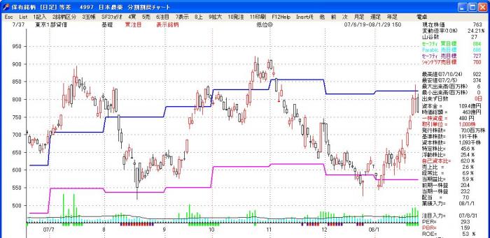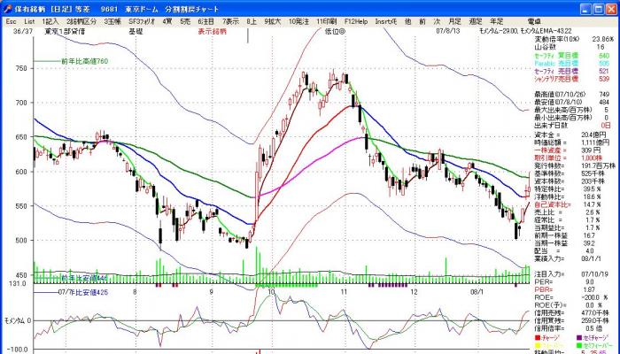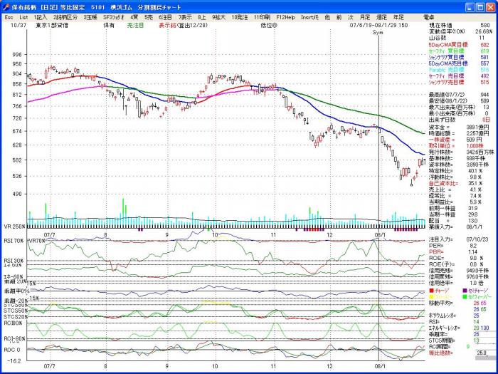 元来は、直近5ヶ月の最高値平均を超えて来た時は買い出動と言う手法ですが、「株式管理」では、チャート上に最高値5月平均線を引いてみました。