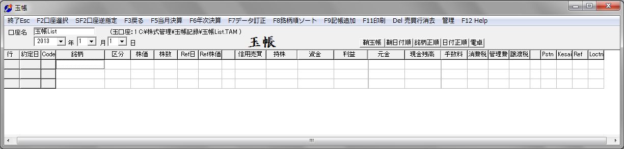 - 玉帳データーは、時系列・銘柄コード順に自動表示されます。