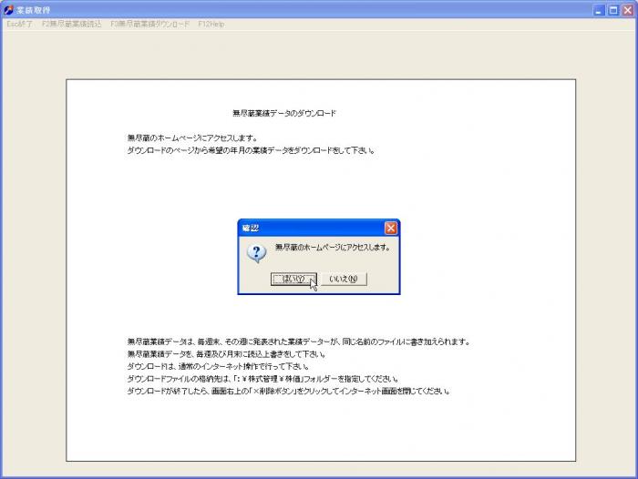 立ち上がった「業績取得」画面で、「F3無尽蔵業績ダウンロード」をクリックします。