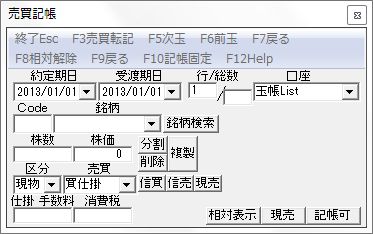 玉帳の取引きデーターを、売買画面の売買データーとして利用したい時に、「玉帳」の「F7データー訂正」で取引きデーターを記帳画面に呼び出し、「F3売買転記」で売買画面の売買データーとして転記保存できます。