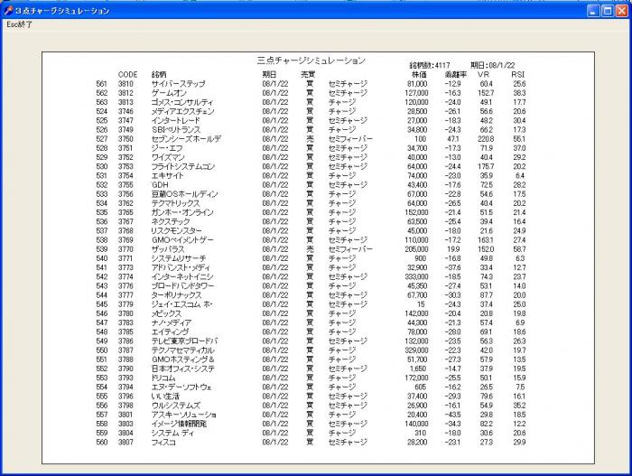 3点チャージシミュレーションの実行結果は、該当銘柄名、買い指標の「3点チャージ」・「セミチャージ」、売り指標の「フィーバー」・「セミフィーバー」、仕掛値又は決済値(シミュレーション期日終値)、乖離率(%)、VR(%)、RSI(%)が、画面表示されます。