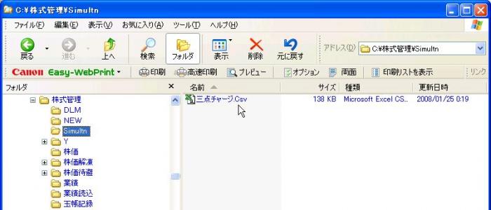 3点チャージシミュレーションの実行結果は、「C:¥株式管理¥Simultn」フォルダーに「三点チャージ.Csv」ファイルが作られ格納されます。