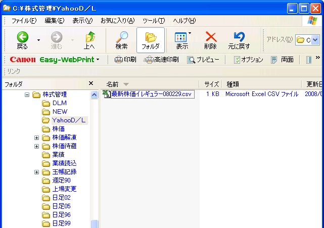 ダウンロードされた株価は、例によって「C:¥株式管理¥株価」フォルダーに蓄積されます。