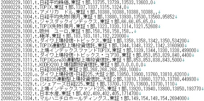 実際のダウンロード株価ファイルは次のようになって居ます。